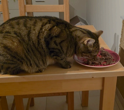 "Meine erste Lieferung ist da. Und mein Kater Toby war so wild darauf, dass ich nicht einmal den Teller auf seinen Futterplatz stellen durfte. Er frisst so viel und wild wie er es noch nie tat.